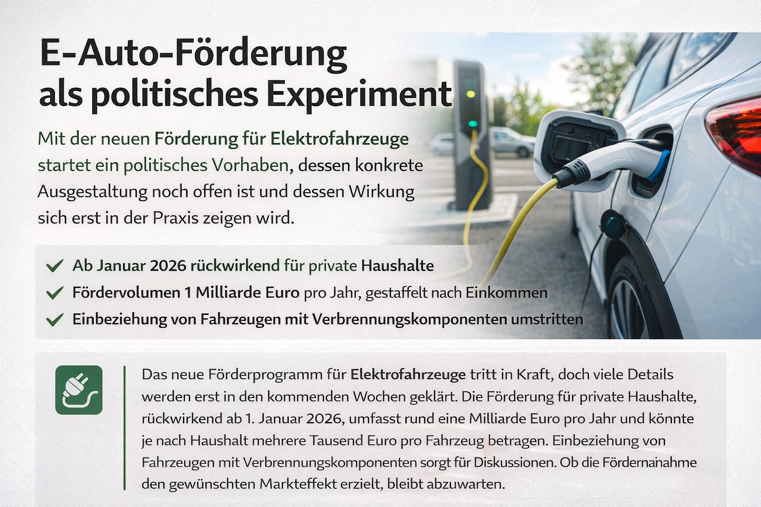 Mit der neuen Förderung für Elektrofahrzeuge startet ein politisches Vorhaben, dessen konkrete Ausgestaltung noch offen ist und dessen Wirkung sich erst in der Praxis zeigen wird.